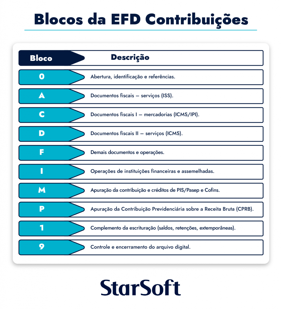 Cada informação registrada na EFD Contribuições é organizada por blocos, que agrupam os dados conforme o tipo de operação, documento ou apuração. Essa estrutura padroniza a escrituração e contribui para o controle fiscal da Receita Federal.