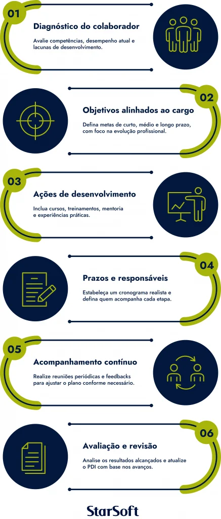 A seguir, veja as seis etapas fundamentais para criar um plano de desenvolvimento individual, com a aplicação prática em um caso fictício.